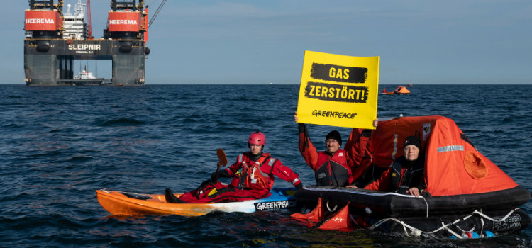 Gegen die klimaschädliche Förderung von fossilem Erdgas protestieren Greenpeace-Aktivist:innen heute rund 20 Kilometer nordwestlich der Nordseeinsel Borkum, wo der niederländische Energiekonzern One Dyas heute eine Förderplattform installieren will. Die 18 Klimaschützer:innen aus Deutschland und den Niederlanden haben drei Schwimminseln verankert, weitere Aktivist:innen demonstrieren in Schlauchbooten und Kajaks für den Schutz des Wattenmeers. Ihre Fahnen und Banner tragen die Schriftzüge “Gas zerstört!” und “No New Gas”. One Dyas will an dieser Stelle das Erdgasfeld N-05A ausbeuten.