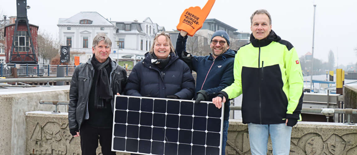 Am Hafen von Oldenburg trafen sich die Protagonisten der Energie-Zukunft in Bürger:innenhand (v.l.n.r. Olaf Schmidt, Stefanie Eilers, Sebastian Specht, Wolf-Dietrich Hufenbach) | foto.hufenbach